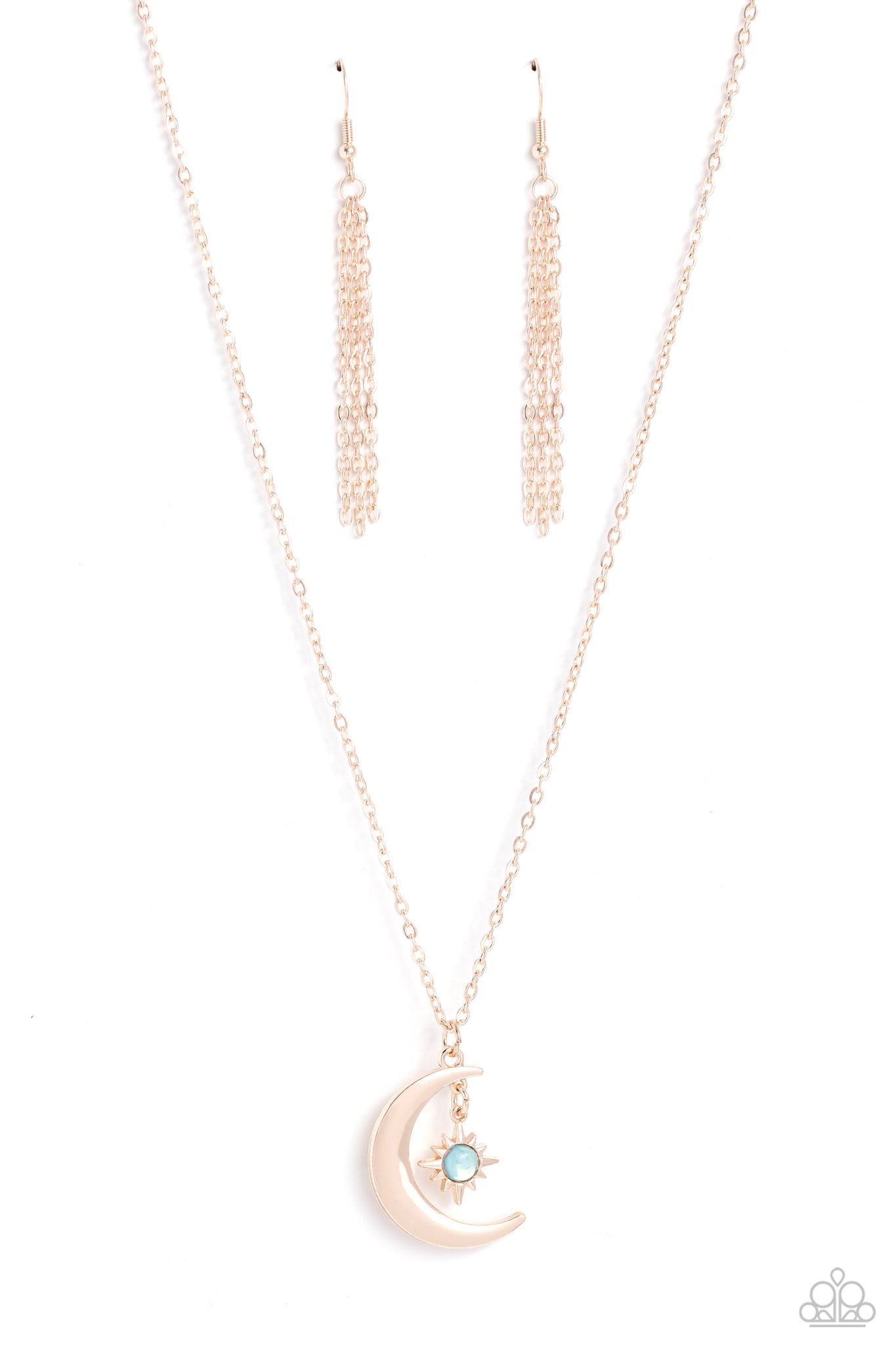 A glassy blue bead is pressed into the center of a three-dimensional rose gold star that dances from the top of a rose gold crescent moon pendant, creating a celestial pendant at the bottom of a dainty rose gold chain. Features an adjustable clasp closure.